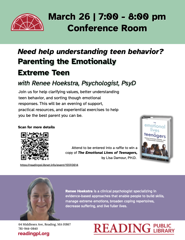 - March 26 — Parents seeking support and tips for raising teens are welcome to attend Parenting the Emotionally Extreme Teen, led by clinical psychologist Renee Hoekstra. Attendees will find assistance clarifying values, understanding teen behavior, and sorting through emotional responses. Participants will be entered in a raffle for a copy of Lisa Damour’s The Emotional Lives of Teenagers.
