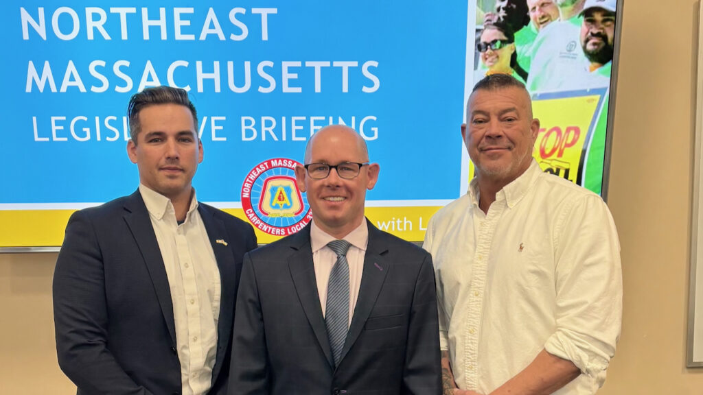 The North Atlantic States Regional Council of Carpenters represents thousands of union carpenters across Massachusetts, Maine, New Hampshire, Vermont, Rhode Island, and Connecticut. Pictured (l-r): Business Manager Local 339, Justin Anshewitz, Representative Haggerty, and Business Representative Local 339, Chris Galatis.
