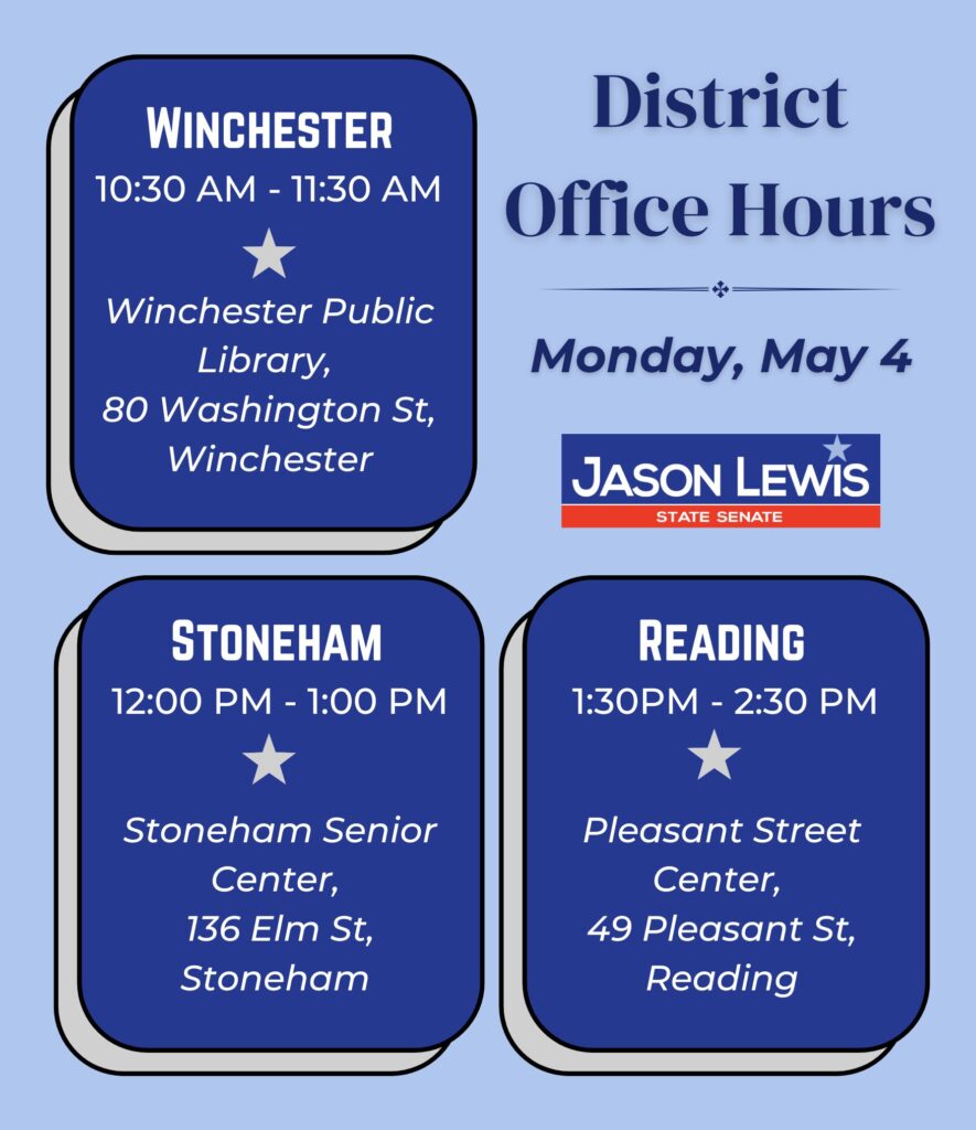 Reading, MA — State Senator Jason Lewis will be holding Office Hours in Reading on Monday, May 4, 2026, from 1:30-2:30 p.m. at the Pleasant Street Center (49 Pleasant St).