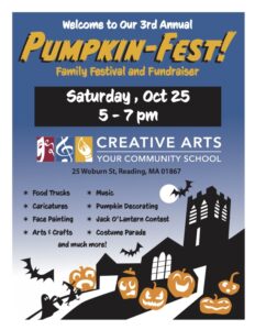 3rd Annual PumpkinFest at Creative Arts Reading, MA — Creative Arts is celebrating its 3rd Annual PumpkinFest Family Festival and Fundraiser on Saturday, October 25, 2025, at 5:00-7:00...