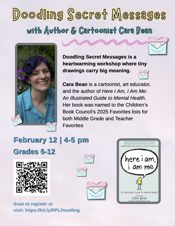 Reading, MA — On Thursday, February 12, at 4:00 pm, cartoonist Cara Bean visits the Reading Public Library for Doodling Secret Messages, a heartwarming workshop where tiny drawings carry big meaning.