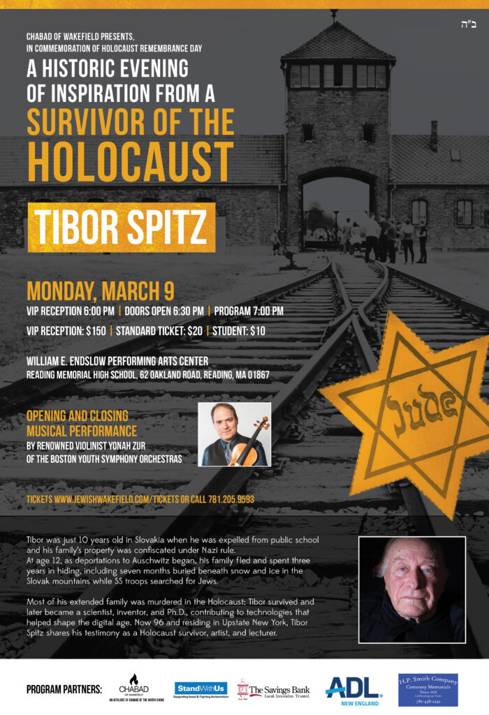 READING, MA — Chabad of Wakefield will host a rare and historic evening on Monday, March 9 at 7:00 p.m. as Holocaust survivor Tibor Spitz shares his testimony in person at Reading Memorial High School’s William Endslow Performing Arts Center, together with community and corporate sponsors.