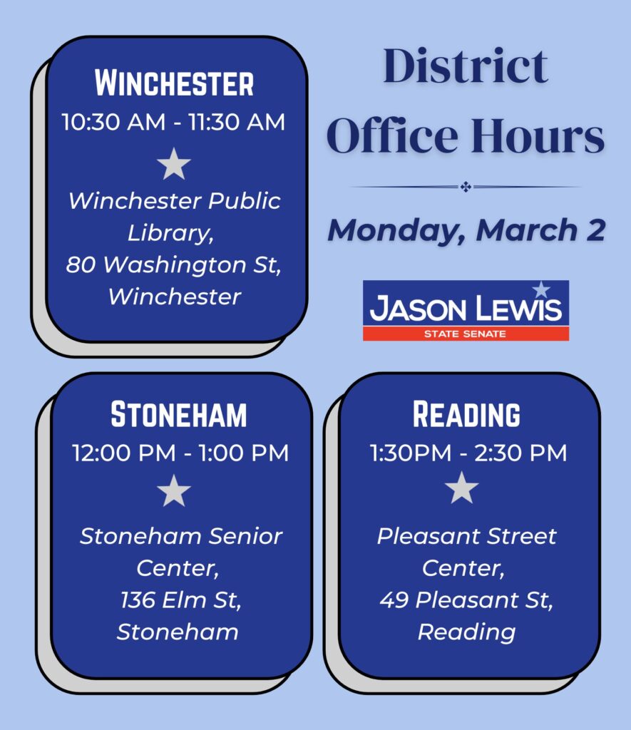 State Senator Jason Lewis will be holding Office Hours in Reading on Monday, March 2, 2026, from 1:30-2:30 p.m. at the Pleasant Street Center (49 Pleasant St).
