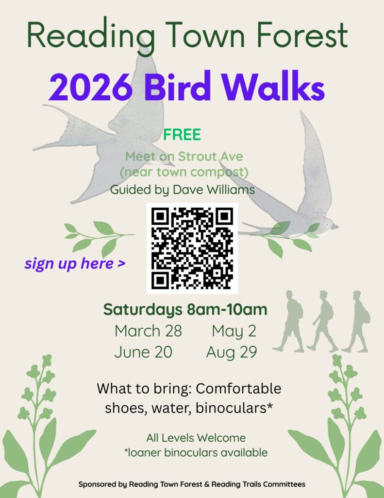 Reading, MA — Join us for a series of free guided bird walks in the Reading Town Forest, led by Dave Williams.