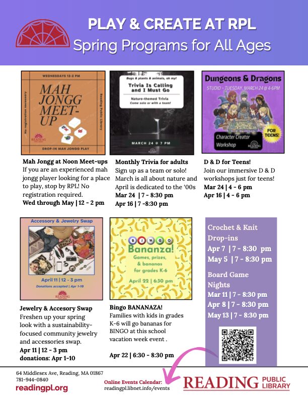 Reading Public Library (RPL), Reading, MA — Spring is coming–it’s time to shake off the winter blahs! This spring the Library features programs designed to inspire and delight all ages.