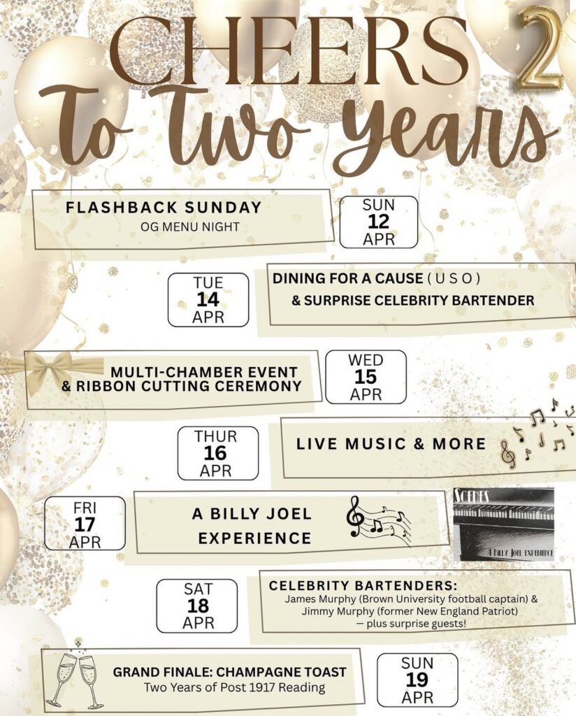 READING, MA — Post 1917 is raising a glass to its two-year anniversary with a full week of celebrations from Sunday, April 12, through Sunday, April 18. The modern steakhouse will host a series of themed events, inviting guests to join in honoring the community that has supported it since opening.
