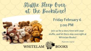 Whitelam Books to Host Stuffie Story Time and Sleep Over Reading, MA – Whitelam Books is excited to host our Third Annual Stuffie Story Time and Sleep Over on...