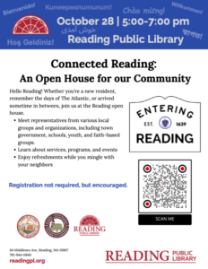 Connected Reading: An Open House for Our Community Reading, MA — Calling All Reading Residents! Whether you’re a new resident, remember the days of The Atlantic, or...