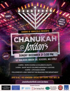 Community Chanukah Celebration at Jordan’s Furniture in Reading Chabad of Wakefield invites families to an afternoon of crafts, magic, festive treats, and the lighting of a nine-foot...