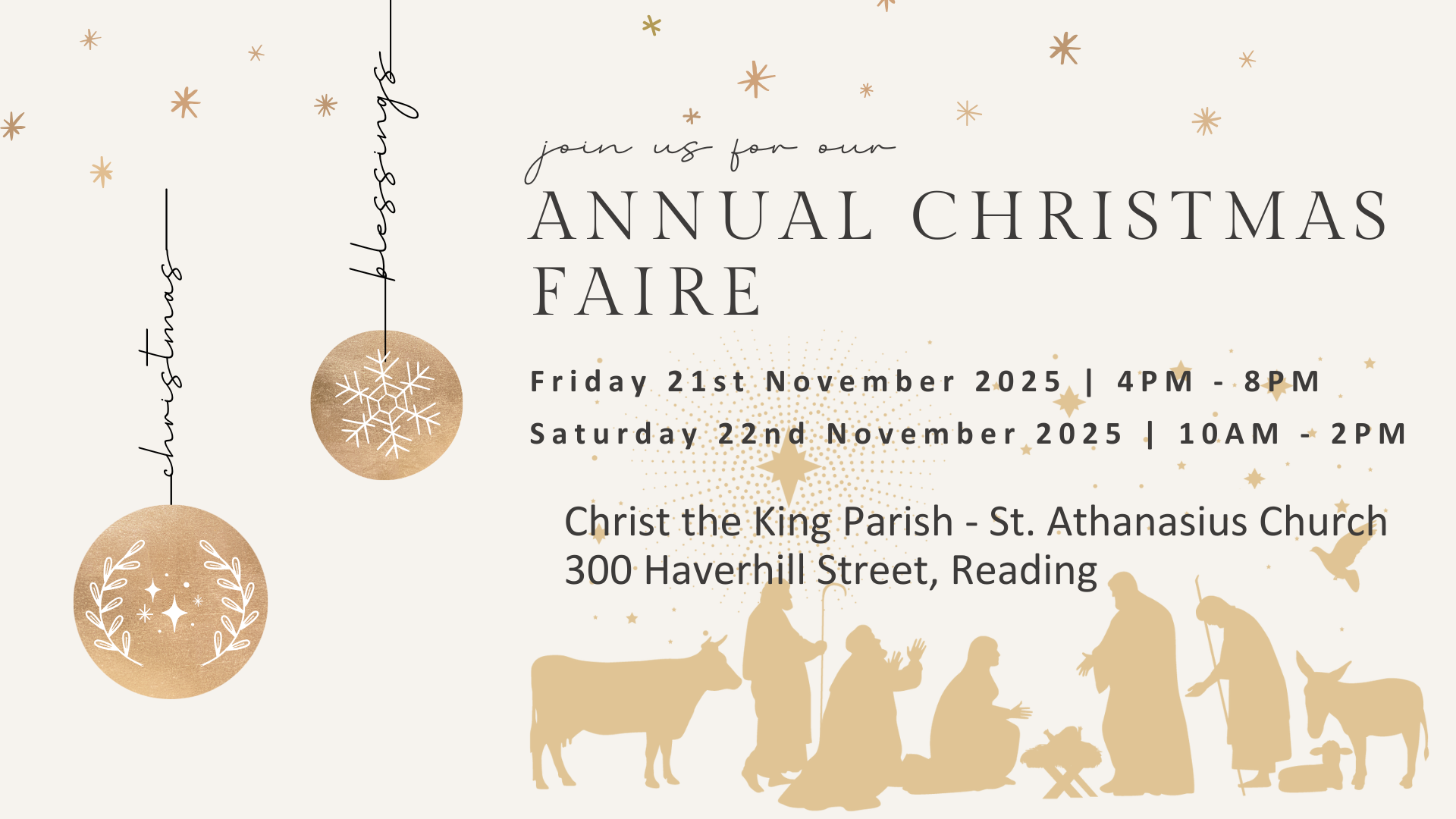 Christ The King Parish is excited to announce the return of its annual Christmas Faire, a beloved community tradition filled with holiday cheer, unique finds, and festive spirit. The event will take place on Friday, November 21, from 4:00 to 8:00 PM, and Saturday, November 22, from 10:00 AM to 2:00 PM at the Parish Center, located at 300 Haverhill Street, Reading.